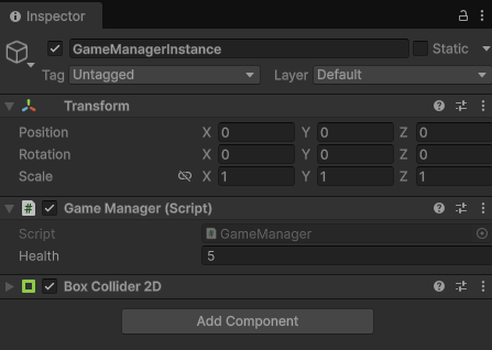public class GameManager : MonoBehaviour { public int health; void Start() { } void Update() { } } ![]() 3. 다음의 MyPlayer.cs 파일을 MyPlayerObject 오브젝트에 컴포넌트로 추가한다.MyPlayer.cs 파일using UnityEngine;