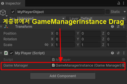 | Inspector에서 오브젝트를 드래그하면 해당 오브젝트에 붙어 있는 컴포넌트가 자동으로 연결된다. 왜 드래그만 하면 자동으로 연결될까? 이유를 알아 보자. 먼저 테스트 환경을 만든다. 1. 계층뷰에서 빈오브젝트로 GameManagerInstance와 MyPlayerObject를 만든다.![]() 2. 다음의 GameManager.cs 파일을 GameManagerInstance 오브젝트에 컴포넌트로 추가한다.GameManager.cs 파일using UnityEngine;