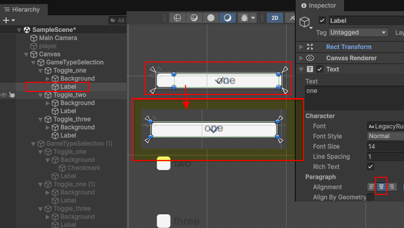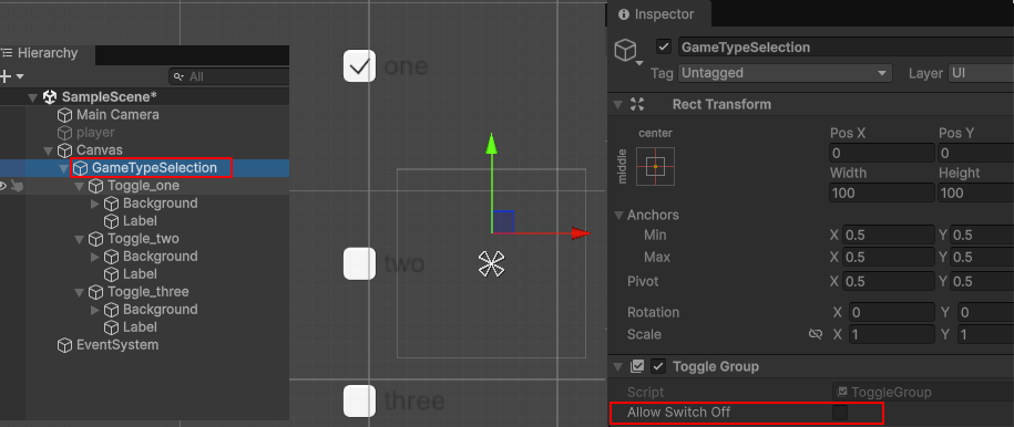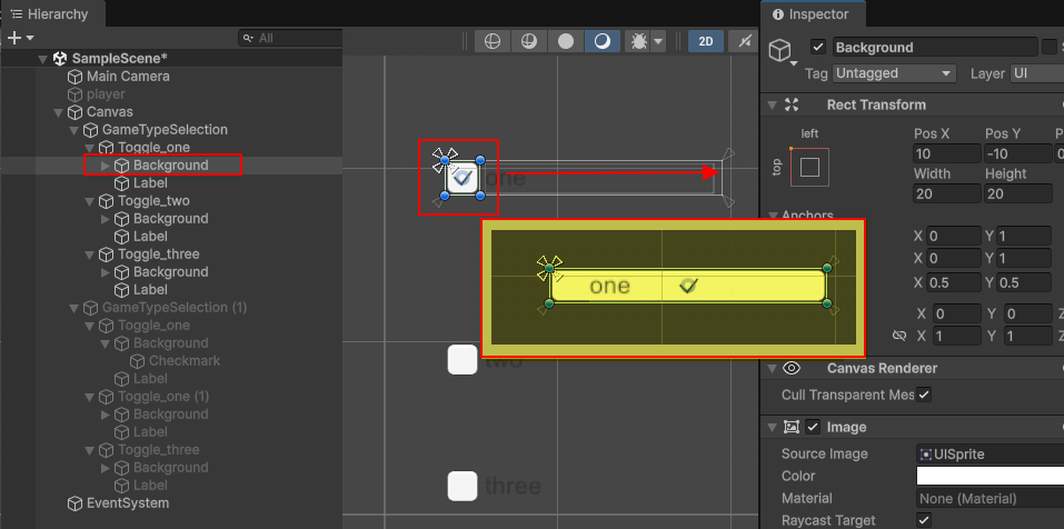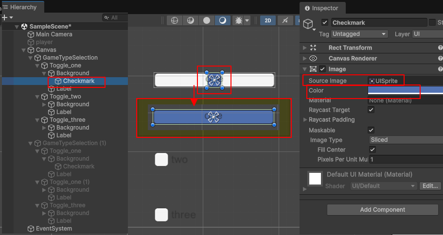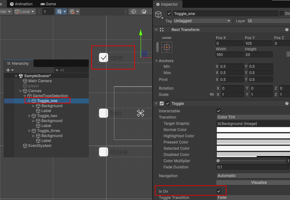 Toggle 버튼을 이용해서 라디오 버튼을 만들어 보겠습니다.Toggle을 별도의 수정없이 체크 박스 형태의 라디오 버튼을 만들어 보겠습니다.1. 계층뷰에서 "Create Empty"으로 빈 오브젝트를 생성합니다.2. 생성한 빈 오브젝트에 "Toggle Group" 컴포넌트를 추가 합니다. 3. "Allow Switch Off" 항목을 체크 해제 합니다. Allow Switch Off = true 이면 ---> 켜진 Toggle을 다시 클릭하면 OFF 가능 ![]() 4. 마우스 오른쪽 버튼을 UI > Toggle 추가합니다. 위 그림에서는 추가한 세개의 Toggle을 각각 Toggle_one, Toggle_Two, Toggle_three로 이름을 변경 합니다. 5. 세개의 Toggle중에 하나만 "Is On"에 체크 합니다. 나머지 두개의 Toggle에 있는 "Is On"은 체크 해제 합니다. ![]() 실행 화면은 다음과 같습니다. ![]() Toggle을 수정하여 버튼 형태의 라디오 버튼을 만들어 보겠습니다.1. 체크 박스형의 라디오 버튼을 단계를 따라 만들기 2. Background를 선택하고 Toggle_one의 크기까지 늘려 조정 합니다. ![]() 3. Label을 선택하고 Paragraph를 중간으로 지정후에 Rect Tool로 Toggle_one의 크기까지 늘려 조정 합니다. ![]() 4. Checkmark를 선택하고 Source Image, Color를 수정하고, Checkmark의 크기를 Toggle_one의 크기까지 늘려 조정 합니다. Source Image는 Checkmark에서 UISpite(다른것도 가능)로 지정 체크시 Color를 원하는 칼라로 지정 ![]() 실행 화면입니다. ![]() |