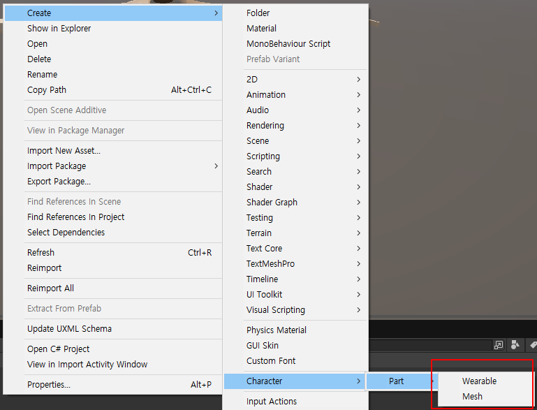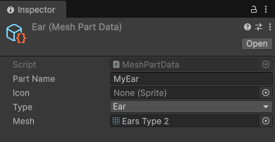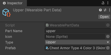 [CreateAssetMenu(menuName = "Character/Part/Mesh")] public class MeshPartData : PartData { public Mesh mesh; public override PartCategory Category => PartCategory.Mesh; } WearablePartData.cs using UnityEngine;